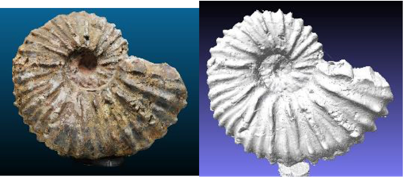 左:アンモナイト標本(Caly coceras orientale, 地質標本館登録標本 GSJ F3237)の3Dモデル、幅約15 cm。 右:一見すると写真のようだが、その実体は座標と色の情報を併せ持つ数百万点の「点群データ」をもとに作られている。 (写真をクリックすると大きなサイズで表示されます)